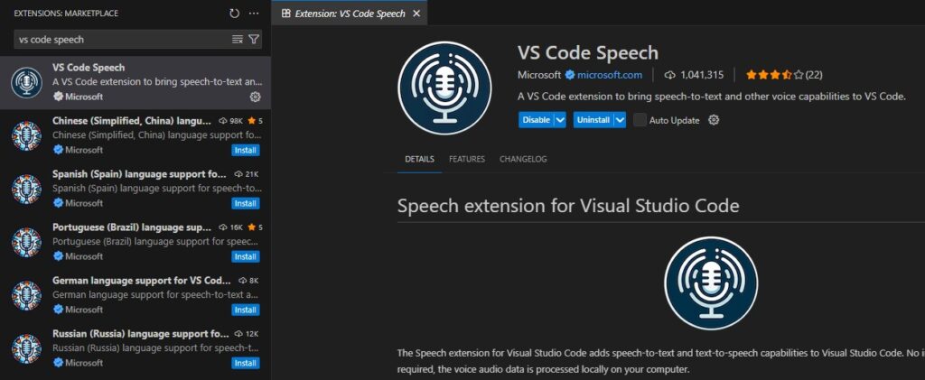 The extension adds speech-to-text and text-to-speech features inside VS Code.