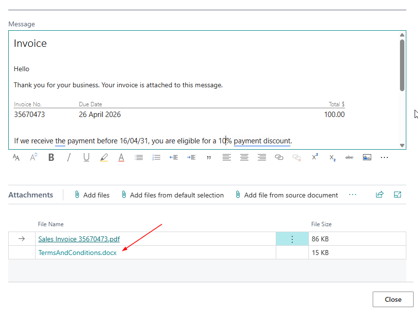 If you always send documents like Terms and Conditions with invoices, donโt rely on users to attach them manually.